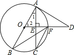 分析:(1)根据OD⊥AC,得到∠1+∠2=90°,再用同弧所对的圆周角相等得到∠1=∠BFC,然后等量代换得到∠OAD=90°,证明AD是⊙O的切线.(2)根据垂径定理求出AE的长,由同弧所对的圆周角相等得到∠C=∠B,求出EF的长,然后在直角△OAE中利用勾股定理求出圆的半径OA的长,再在直角△OAD中用三角函数求出AD的长.