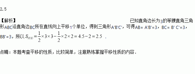 如图,直角边长为3的等腰直角三角形ABC沿直角边BC所在直线向上平移1个单位,得到三角形A'B'C',则阴影部分的面积为____________。