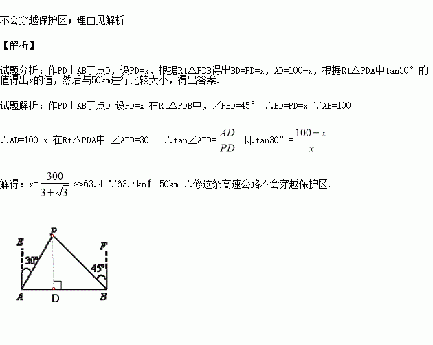 如图所示,A、B两城市相距100km. 现计划在这两座城市间修筑一条高速公路(即线段AB),经测量,森林保护中心P在A城市的北偏东30°和B城市的北偏西45°的方向上. 已知森林保护区的范围在以P点为圆心,50km为半径的圆形区域内. 请问:计划修筑的这条高速公路会不会穿越保护区. 为什么?(参考数据: