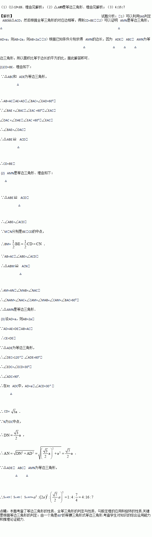 如图1,若△ABC和△ADE为等边三角形,M,N分别EB,CD的中点,易证:CD=BE,△AMN是等边三角形.