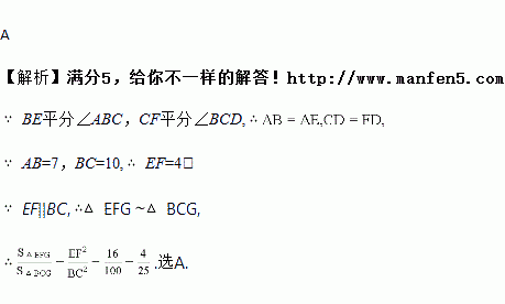 如图,在?ABCD中,BE平分∠ABC,CF平分∠BCD,E、F在AD上,BE与CF相交于点G,若AB=7,BC=10,则△EFG与△BCG的面积之比为( )