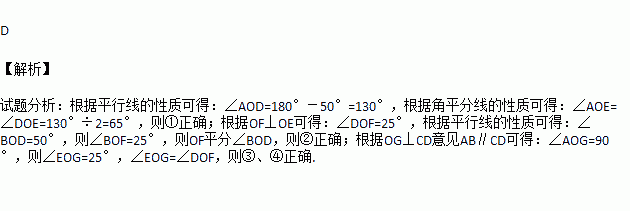 如图,CD∥AB,OE平分∠AOD,OF⊥OE,OG⊥CD,∠D=50°,则下列结论:①∠AOE=65°;②OF平分∠BOD;③∠GOE=∠DOF;④∠GOE=25°.