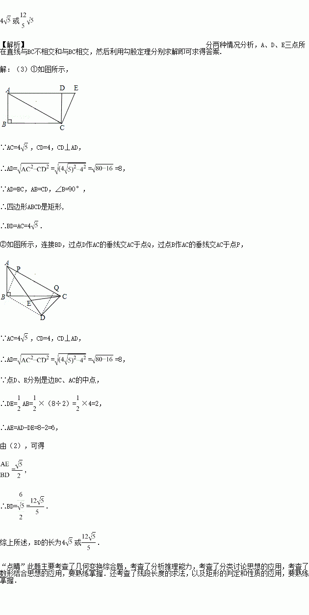 如图,在Rt△ABC中,∠B=90°,BC =2 AB = 8,点D,E分别是边BC,AC的中点,连接DE.将△EDC绕点C按顺时针方向旋转,当△EDC旋转到A,D,E三点共线时,线段BD的长为__.