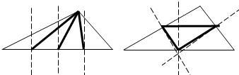22、小明、小刚、小雪、和小影四人一起为小明过生日,他们准备了一块三角形的蛋糕(如图),怎样才能把蛋糕平均分成四块.你能帮忙分一分吗?请在下面作出两种分法示意图.(不写作法,作出分割线,保留作图痕迹即可)