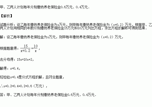 近年来,我国逐步完善养老金保险制度.甲、乙两人计划用相同的年数分别缴纳养老保险金15万元和10万元,甲计划比乙每年多缴纳养老保险金0.2万元.求甲、乙两人计划每年分别缴纳养老保险金多少万元?