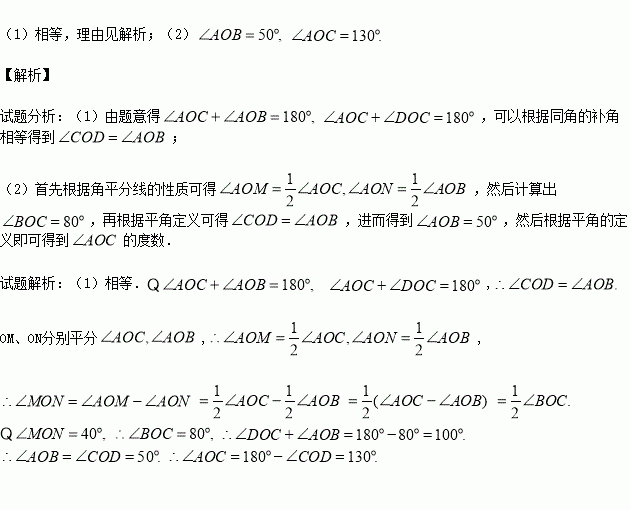 (1)∠COD与∠AOB相等吗?请说明理由;