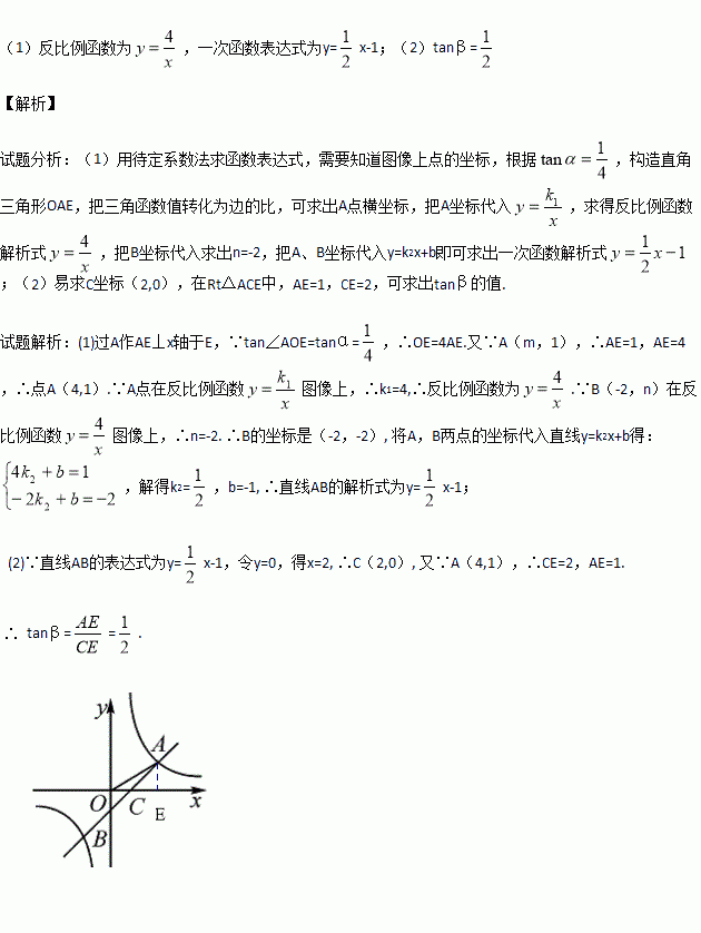 与一次函数y=k2x+b图象的交点为A(m,1),B(-2,n),OA与x轴正方向的夹角为α,且tanα=