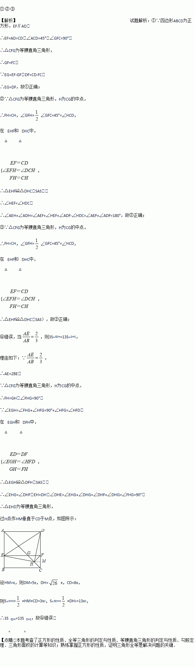 如图,在正方形ABCD中,AC为对角线,E为AB上一点,过点E作EF∥AD,与AC、DC分别交于点G、F,H为CG的中点,连接DE、EH、DH、FH.下列结论:①EG=DF;②∠AEH+∠ADH=180°;③△EHF≌△DHC;④若