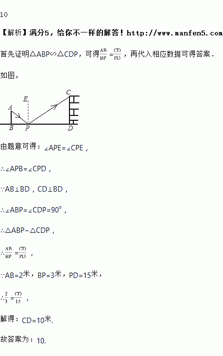 如图是一位同学设计的用手电筒来测量某古城墙高度的示意图.点P处放一水平的平面镜,光线从点A出发经平面镜反射后刚好到古城墙CD的顶端C处.已知AB⊥BD,CD⊥BD,测得AB=2米,BP=3米,PD=15米,那么该古城墙的高度CD是_________米.