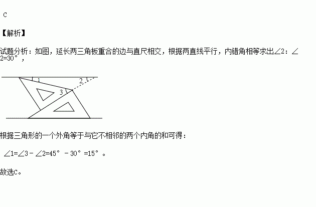 如图,将一副三角板和一张对边平行的纸条按下列方式摆放,两个三角板的一直角边重合,含30°角的直角三角板的斜边与纸条一边重合,含45°角的三角板的一个顶点在纸条的另一边上,则∠1的度数是