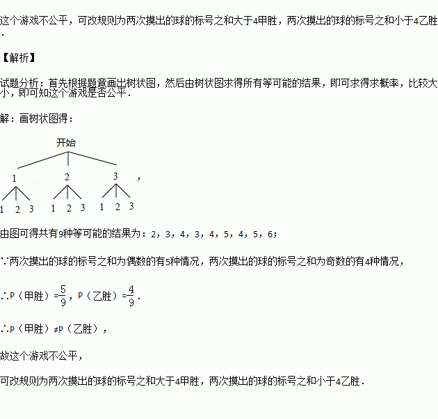 甲乙两名同学做摸球游戏,他们把三个分别标有1,2,3的大小和形状完全相同的小球放在一个不透明的口袋中.从袋中随机摸出一球后放回,摇匀后再随机摸出一球.现制定如下游戏规则:若两次摸出的球的标号之和为偶数时,则甲胜;若两次摸出的球的标号之和为奇数时,则乙胜;试分析这个游戏规则对双方是否公平?请说明理由.若不公平,你认为应该修改游戏规则才能使得规则对双方公平?
