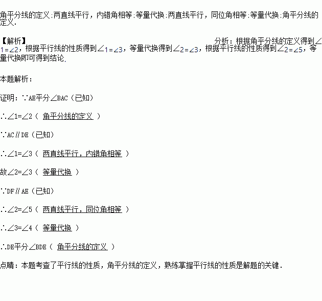 已知:如图,点D、E分别在线段AB、BC上,AC∥DE,DF∥AE交BC于点F,AE平分∠BAC.