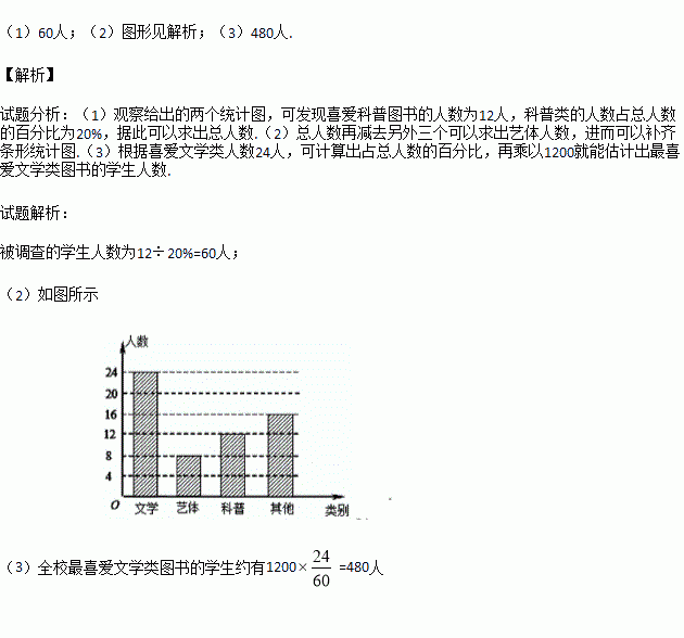 (3)若该校有1200名学生,试估计全校最喜爱文学类图书的学生人数.