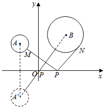 分析 作⊙A关于x轴的对称⊙A′,连接BA′分别交⊙A′和⊙B于M、N,交x轴于P,如图,根据两点之间线段最短得到此时PM+PN最小,再利用对称确定A′的坐标,接着利用两点间的距离公式计算出A′B的长,然后用A′B的长减去两个圆的半径即可得到MN的长,即得到PM+PN的最小值.