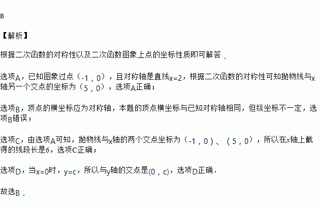 小强的寒假作业上有一道这样的题目,由于不小心被二宝弟弟,撕掉一部分,仅能见到如下文字:“已知二次函数y=ax2+bx+c的图象过点(-1,0),…,求证:这个二次函数的图象关于直线x=2对称.”根据现有信息,题中的二次函数不具有的性质是( )