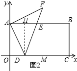 (2)如图2,点M是OC中点,动点D在线段OM上运动(不与0、M两点重合),点E在边AB上,且AD=DE,点F在射线DE上,且AF=AD,设∠FAE=m°,∠OAD=n°,求出m与n之间的函数关系式,并直接写出自变量n的取值范围;
