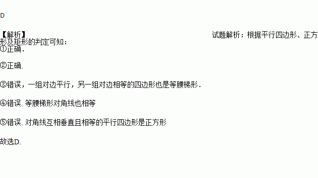 ③一组对边平行,另一组对边相等的四边形是平行四边形.④对角线相等的四边形是矩形.⑤对角线互相垂直且相等的四边形是正方形