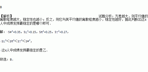 S甲2=0.35,S乙2=0.15,S丙2=0.25,S丁2=0.27,这4人中成绩发挥最稳定的是( )