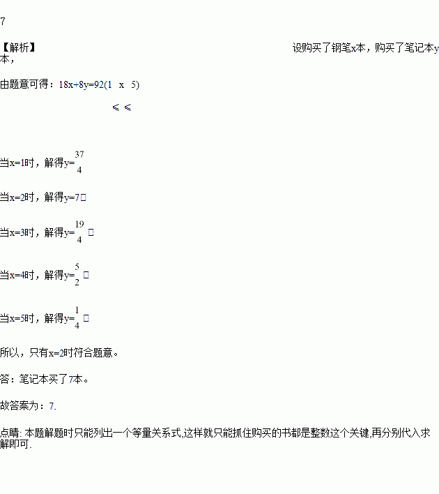 品。已知钢笔和笔记本的单价各为18元和8元,则买了笔记本_______ 本。