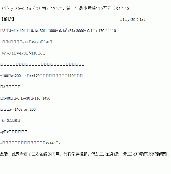 (2)求第一年的年获利W与x之间的函数关系式,并请说明不论销售单价定为多少,该公司投资的第一年肯定是亏损的,最小亏损是少?