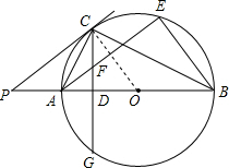 (2)由AE∥PC,得到∠PCA=∠CAF根据垂径定理得到$\widehat{AC}=\widehat{AG}$,于是得到∠ACF=∠ABC,由于∠PCA=∠ABC,推出∠ACF=∠CAF,根据等腰三角形的性质得到CF=AF,在Rt△AFD中,AF=5,sin∠FAD=$\frac{3}{5}$,求得FD=3,AD=4,CD=8,在Rt△OCD中,设OC=r,根据勾股定理得到方程r2=(r-4)2+82,解得r=10,得到AB=2r=20,由于AB为⊙O的直径,得到∠AEB=90°,在Rt△ABE中,由sin∠EAD=$\frac{3}{5}$,得到$\frac{BE}{AB}=\frac{3}{5}$,于是求得结论.