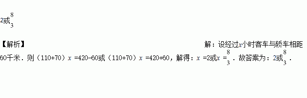 甲乙两城市相距420千米,客车与轿车分别从甲乙两城市同时出发,相向而行。已知客车每小时行70千米,轿车每小时行110千米,经过__________小时客车与轿车相距60千米。