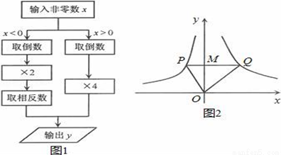 根据图1所示的程序,得到了y与x的函数图象,如图2.若点M是y轴正半轴上任意一点,过点M作PQ∥x轴交图象于点P,Q,连接OP,OQ.则以下结论:
