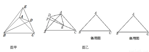 如图乙,△ABC和△ADE是有公共顶点的等腰直角三角形,∠BAC=∠DAE=90°,点P为射线BD,CE的交点.
