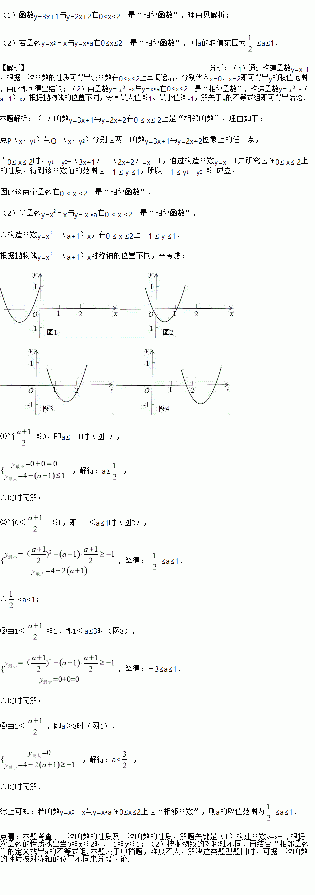 (1)判断函数y=3x+1与y=2x+2在0≤x≤2上是否为“相邻函数”,并说明理由;