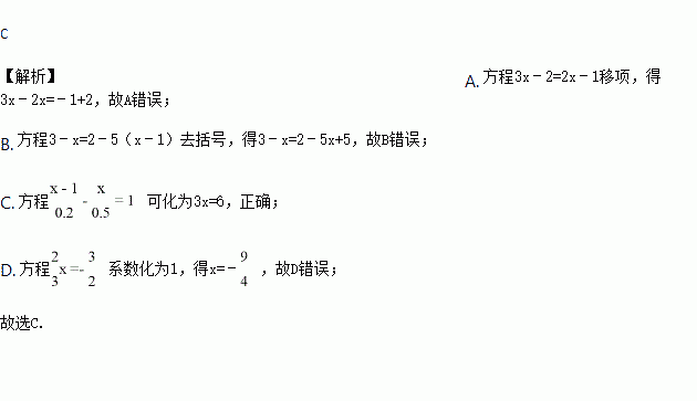 A. 方程3x﹣2=2x﹣1移项,得3x﹣2x=﹣1﹣2