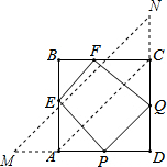 分析:连接AC,延长DA至M,使AM=AP,延长DC到N,使CN=CQ,则当E、F是MN和AB、BC的交点时,四边形PQFE周长最小,则PE+EF+FD的最小值是MN的长,利用勾股定理可求得,利用三角形中位线定理可以求得PQ的长,则四边形的周长的最小值即可求解.