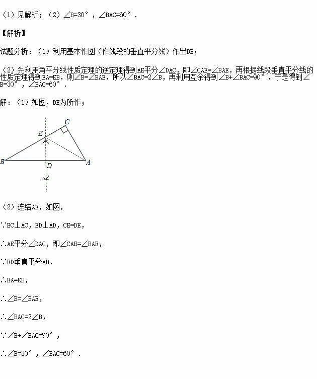 (1)用直尺和圆规作AB的垂直平分线,交AB与D,交BC于E;(不写作法,保留作图痕迹)