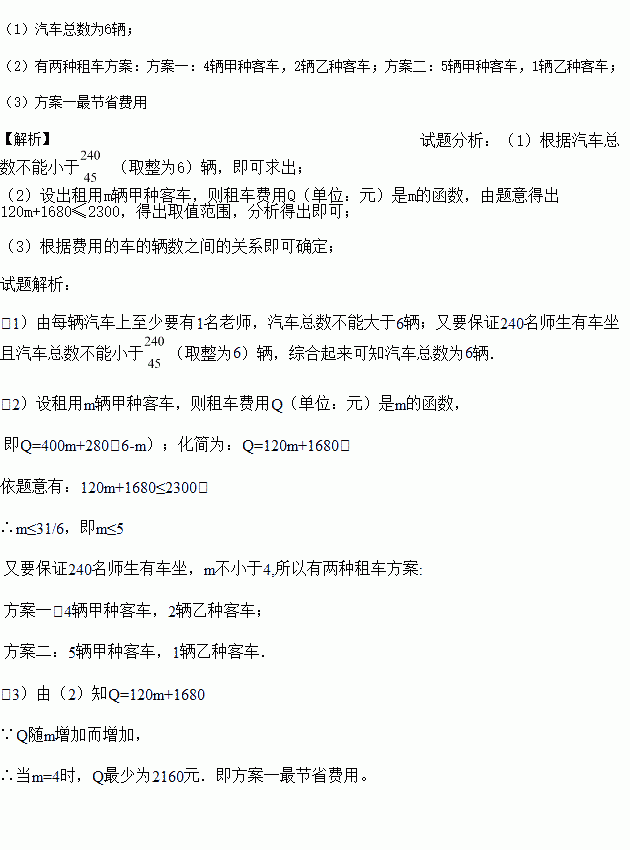 八月份利川市政府计划在总费用2300元的限额内,租用汽车送234名运动员和6名教练到恩施州参加第二届全州青少年运动会,每辆汽车上至少要有1名教练.现有甲、乙两种大客车,它们的载客量和租金如下表: