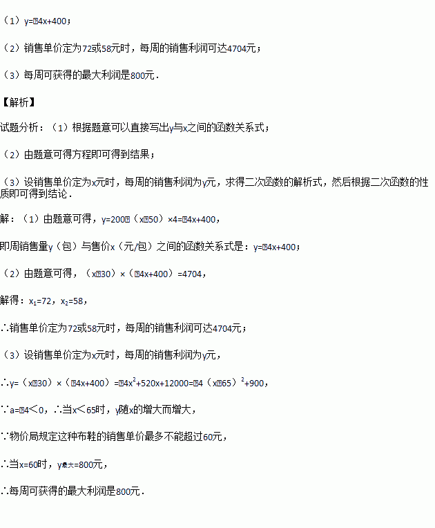 (3)若物价局规定这种布鞋的销售单价最多不能超过60元,那么每周可获得的最大利润是多少元?