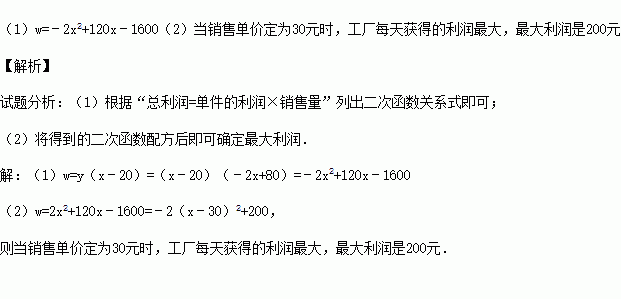 某工厂设计了一款产品,成本为每件20元.投放市场进行试销,经调查发现,该种产品每天的销售量y(件)与销售单价x(元)之间满足y=﹣2x+80 (20≤x≤40),设销售这种产品每天的利润为W(元).