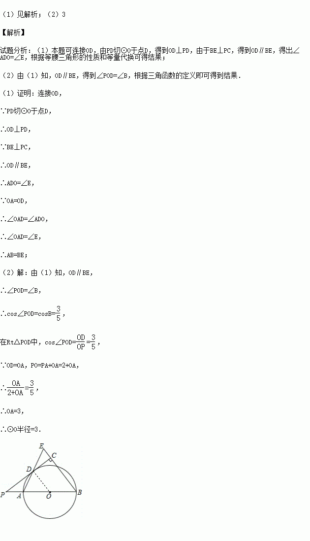 (2015•聊城)如图,已知AB是⊙O的直径,点P在BA的延长线上,PD切⊙O于点D,过点B作BE垂直于PD,交PD的延长线于点C,连接AD并延长,交BE于点E.