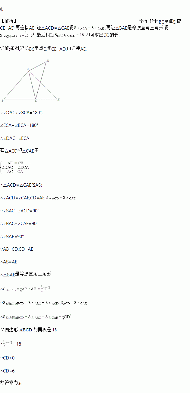 如图,在四边形 ABCD 中,AC 是对角线,AB=CD,∠DAC+∠BCA=180°,∠BAC+∠ACD=90°,四边形 ABCD 的面积是 18,则 CD 的长是__________.