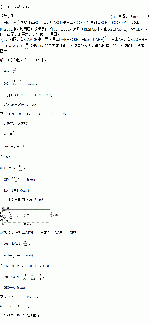 如图,现有一张宽为12 cm的练习纸,相邻两条格线间的距离均为0.6 cm.调皮的小聪在纸的左上角用印章印出一个矩形卡通图案,图案的顶点恰好在四条格线上,已知sinα=