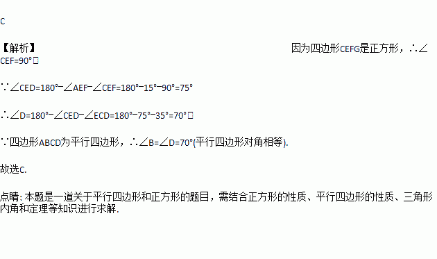 如图,有一平行四边形ABCD与一正方形CEFG,其中E点在AD上.若∠ECD=35°,∠AEF=15°,则∠B的度数为何?( )