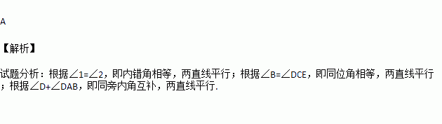 A.∠3=∠4 B.∠1=∠2 C.∠B=∠DCE D.∠D+∠DAB=180°