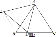 分析 如图1,连接BE,CE,过E作EF⊥BC交BC的延长线于F,根据等边三角形的性质得到∠BAC=∠DAE=60°,AB=AC,AD=AE,于是得到∠BAD=∠CAE,推出△ABD≌△ACE,根据全等三角形的性质得到BD=CE=BC-CD=2,∠ABD=∠ACE=60°,求得∠ECF=60°,解直角三角形得到CF=1,EF=$\sqrt{3}$,根据勾股定理即可得到结论;如图2,连接BE,根据等边三角形的性质得到∠BAC=∠DAE=60°,AB=AC,AD=AE,于是得到∠BAE=∠CAD,推出△ABE≌△ACD,根据全等三角形的性质得到BE=CD=4