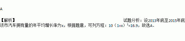 随着居民经济收入的不断提高以及汽车业的快速发展,家用汽车已越来越多地进入普通家庭,抽样调查显示,截止2015年底某市汽车拥有量为16.9万辆.己知2013年底该市汽车拥有量为10万辆,设2013年底至2015年底该市汽车拥有量的平均增长率为x,根据题意列方程得( )