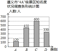 今年5月,从全国旅游景区质量等级评审会上传来喜讯,我市“风冈茶海之心”、“赤水佛光岩”、“仁怀中国酒文化城”三个景区加入国家“4A”级景区.至此,全市“4A”级景区已达13个.某旅游公司为了了解我市“4A”级景区的知名度情况,特对部分市民进行现场采访,根据市民对13个景区名字的回答情况,按答数多少分为熟悉(A),基本了解(B)、略有知晓(C)、知之甚少(D)四类进行统计,绘制了一下两幅统计图(不完整),请根据图中信息解答以下各题: