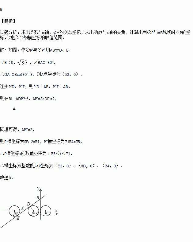 ),∠BAO=30°,圆心P的坐标为(1,0).⊙P与y轴相切于点O,若将⊙P沿x轴向左移动,当⊙P与该直线相交时,横坐标为整数的P′的个数是( )