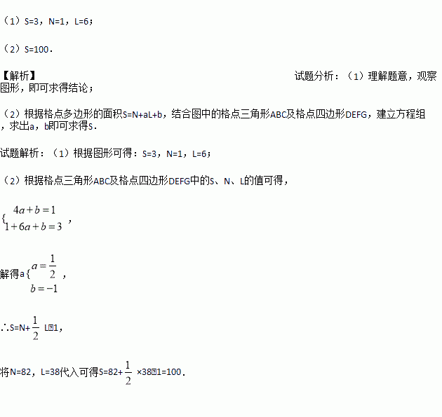 ⑵ 已知任意格点多边形的面积公式为S=N+aL+b,其中a,b为常数.当某格点多边形对应的N=82,L=38,求S的值.
