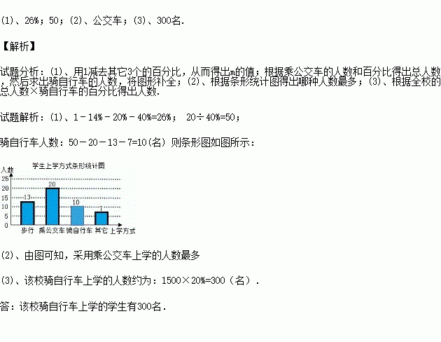 (3)如果该校共有1500名学生,请你估计该校骑自行车上学的学生有多少名?