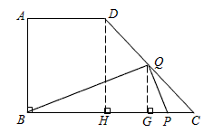 | (2)当点P、Q运动的时间为t(s), 则PC=t, ① 当Q在CD上时,过Q点作QG⊥BC,垂足为点G,则QC=2 又∵DH=HC,DH⊥BC, ∴∠C=45°, ∴在Rt△QCG中,QG=QC·sin∠C=2 又∵BP=BC-PC=14-t, ∴S△BPQ= 当Q运动到D点时所需要的时间t= ∴S=14t-t2(0<t≤4); ② 当Q在DA上时,过Q点作QG⊥BC, 则:QG=AB=8cm,BP=BC-PC=14-t, ∴S△BPQ= 当Q运动到A点时所需要的时间t= ∴S=56-4t(4<t≤4+ 综合上述:所求的函数关系式是: S=14t-t2(0<t≤4), S=56-4t(4<t≤4+ |
