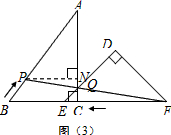 (3)假设存在某一时刻t,使点P、Q、F三点在同一条直线上,过P作PN⊥AC,交AC于N,易得△PAN∽△BAC,利用相似三角形的性质可得PN,AN,NQ,因为∠ACB=90°,B、C(E)、F在同一条直线上,可得△QCF∽△QNP,利用相似三角形的性质列式,可解得结果.