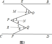 作OM∥AB,PN∥CD,QR∥AB,如图3,