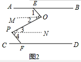 证明:作OM∥AB,PN∥CD,如图2,![]()